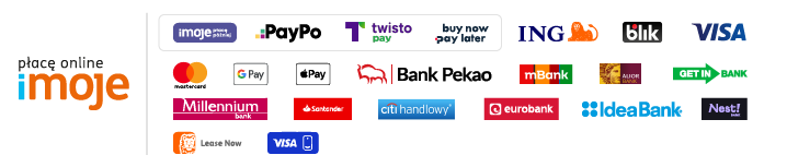 Płatności online imoje– możesz zapłacić za zamówione towary poprzez zewnętrzny system płatności imoje, obsługiwany przez ING Bank Śląski S.A. z siedzibą w Katowicach. Bramka płatności imoje pozwala na realizację szybkich płatności za pomocą m.in. BLIK, szybkich przelewów, kart płatniczych oraz płatności odroczonych.
